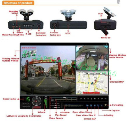 1)G-sensor, GPS and Image data will be recorded and playable by software player; 2)Front and back view;